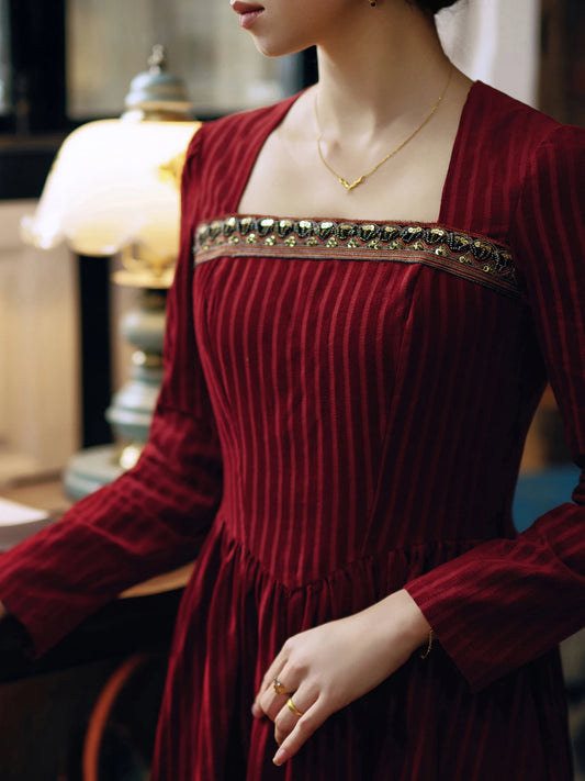 TIYIHAILEY Women 100% Cotton Corduroy Dress Full Sleeve Long Maxi Ladies S-XL Vintage High Waist 2025 Wine Red Beaded Winter