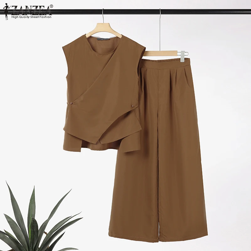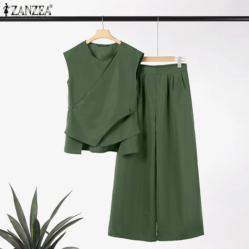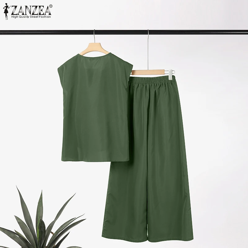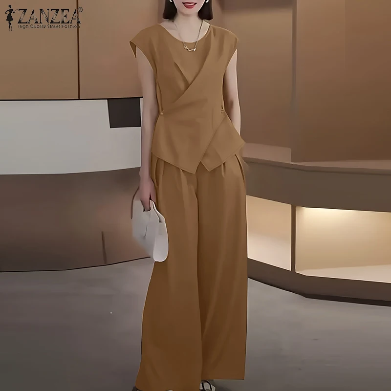 2025 ZANZEA Summer Pant Sets 2PCS Office Women Outfits Solid Work OL Tracksuits Elegant Sleeveless Blouse Suit Matching Sets