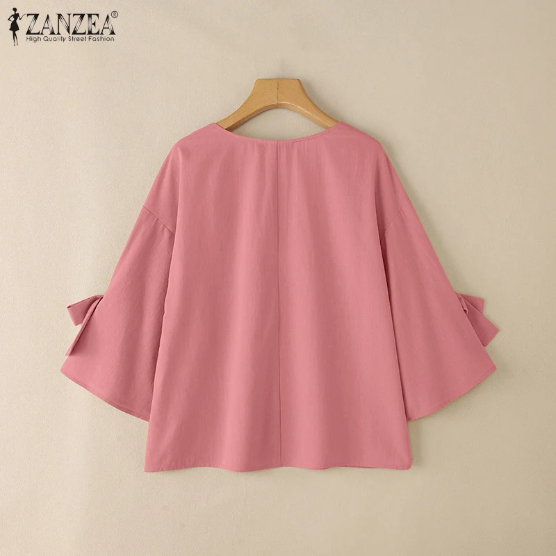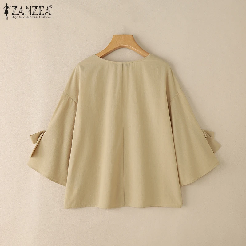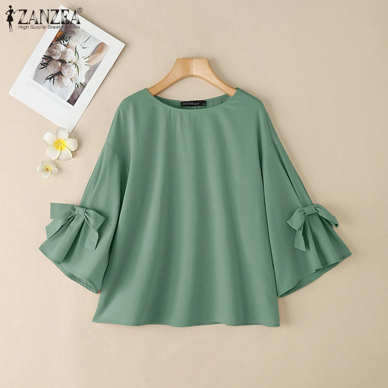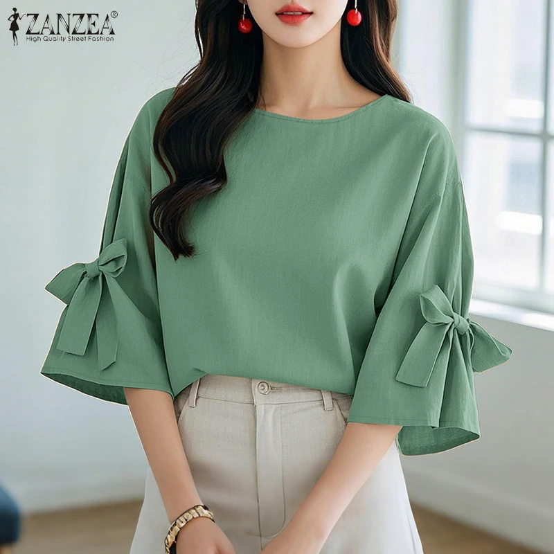 Fashion Summer Blouse 2025 ZANZEA Women Solid Work OL Tops Elegant O Neck 3/4 Sleeve Bow Shirt Casual Loose Chemise Blusas Femme