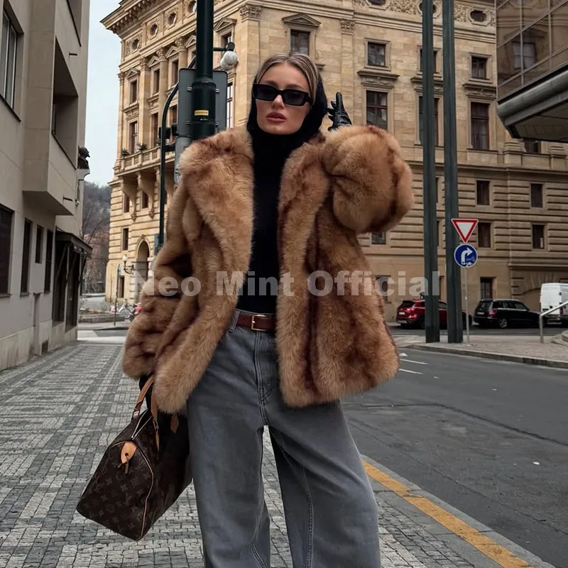 Neo Mint Luxury Brand Fashion Women Yellow Striped Faux Fur Jacket Coat Chic Girls 2025 Winter Oversized Warm Outerwear Overcoat