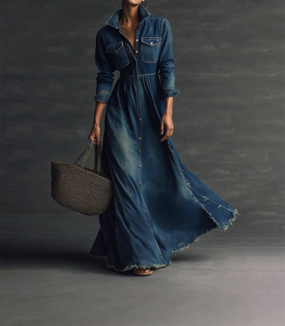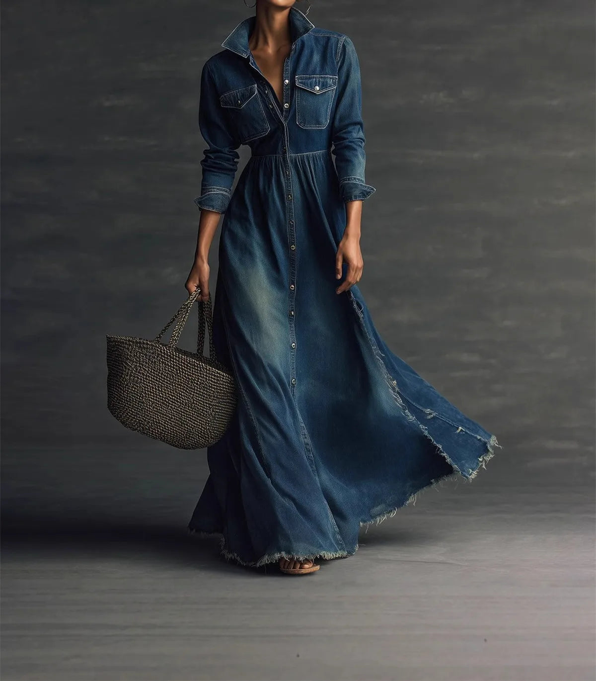 New Fashion Casual Long Sleeve Turn-down Collar Single Breasted Pockets Solid Color Split Flare And Fit Ankle-Length Demin Dress
