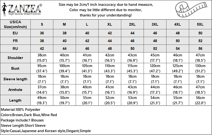| Item Type:Blouses Material:100% Polyester Colors:Brown,Dark Blue,Wine Red Package include:1 Blouses Cutting:Regular Stretch:Not Stretchable Collar:Round Neck Sleeve Style:Ruffle Sleeve Sleeve Length:Short Sleeve Decoration:Ruffles Pattern:Solid Thickness:Standard Style:Casual,Japanese and Korean style,Elegant,Simple Season:Spring,Summer,Autumn Occasion:Daily,Simple,Casual Label: Yes Attention: 1. Due to different computers, there may be subtle color difference between the object and the image. Please don't shoot if you mind. Thank you. 2. There may be manual measurement error of 1-3cm. Please understand the inconvenience. 3. Please refer to the real object. The model pictures are for reference only. 4. Attention!!! Please check the size chart carefully before ordering." |