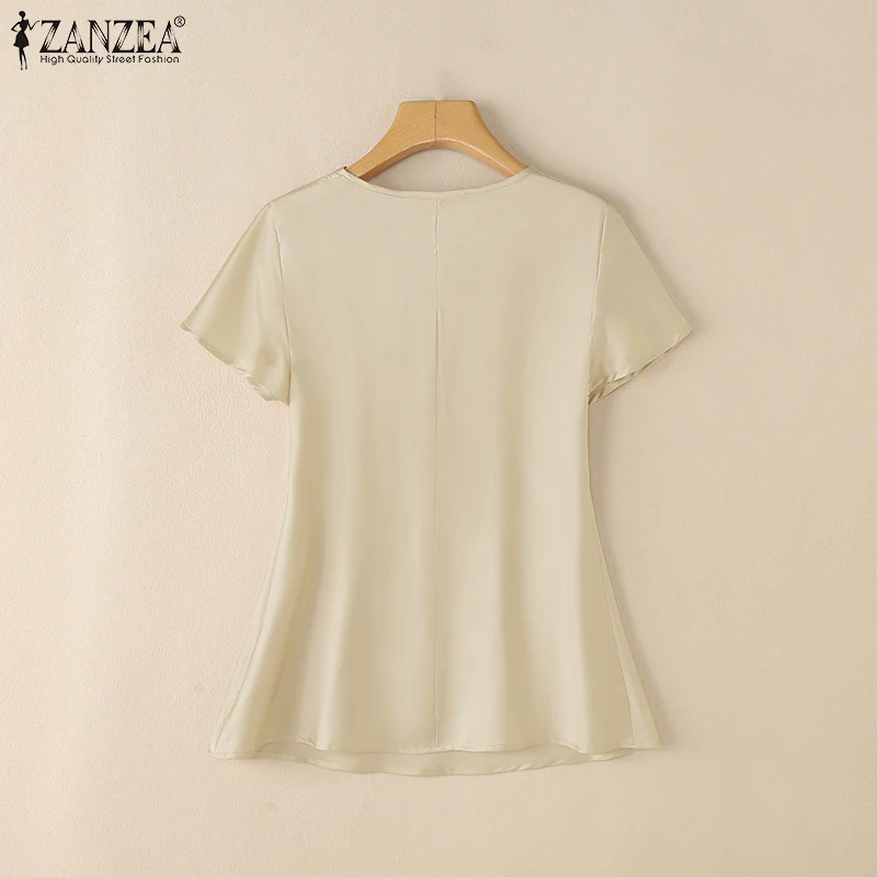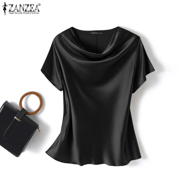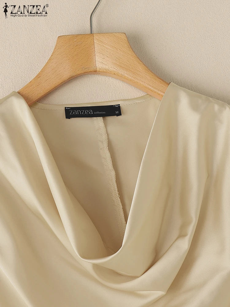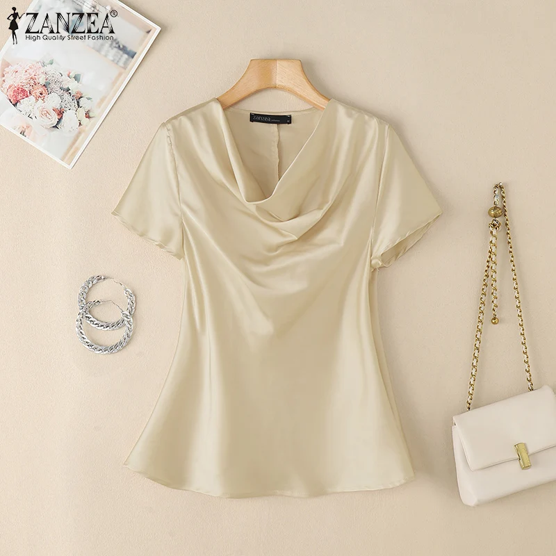 ZANZEA Casual Satin Party Tops Woman Cowl Neck 2025 Fashion Korean Style Blouses Elegant Short Sleeve Solid Color Blusas Mujer