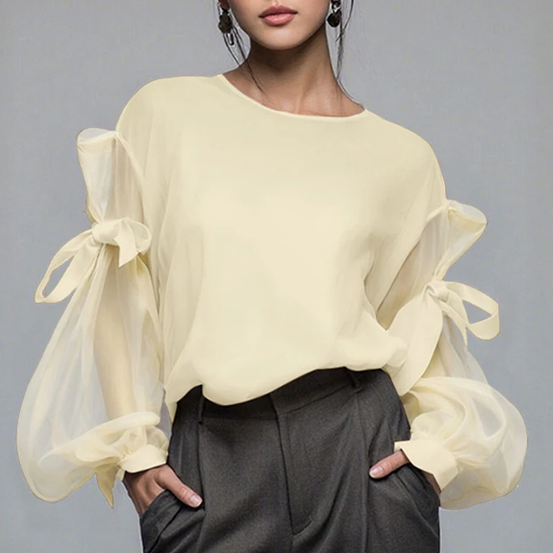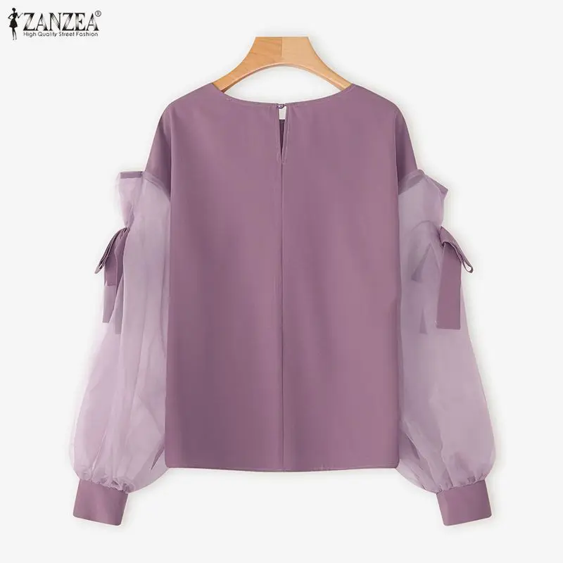 ZANZEA Elegant Bow Women Blouse 2025 Autumn Fashion Mesh Patchwork Long Lantern Sleeve Casual Tops Shirts Korean Ladies Blusas
