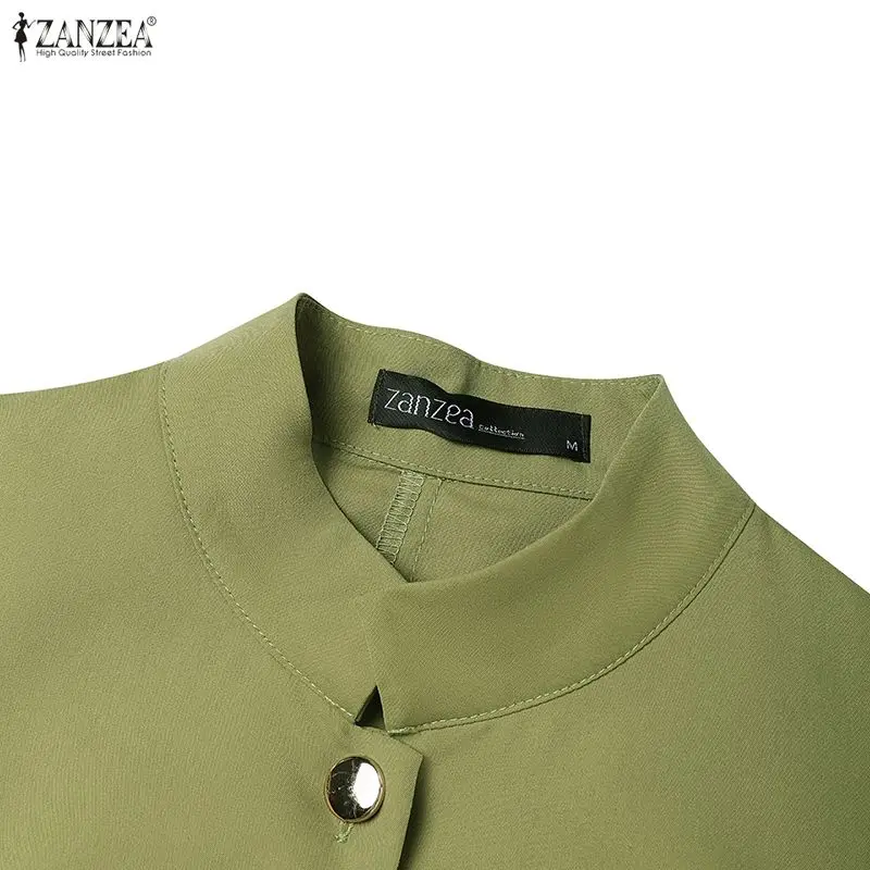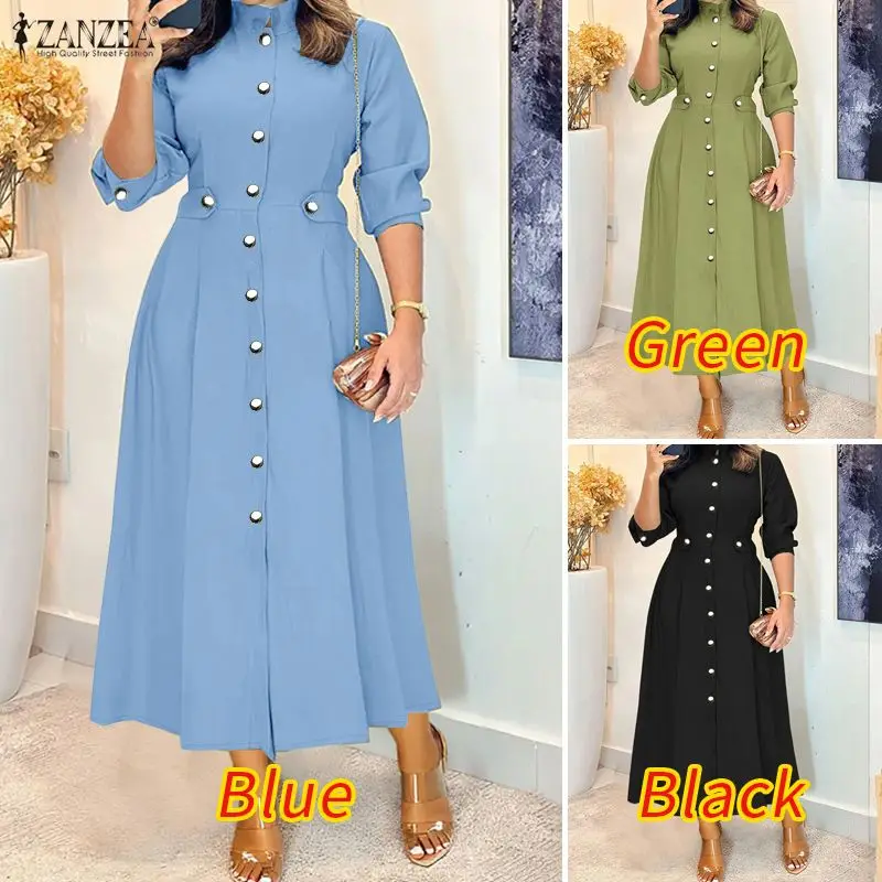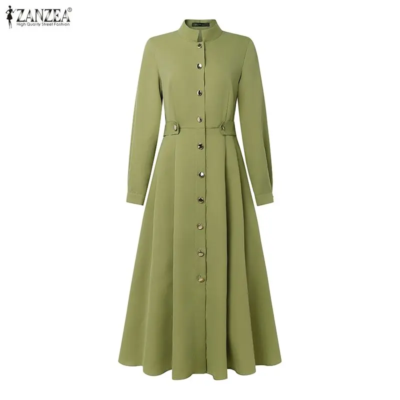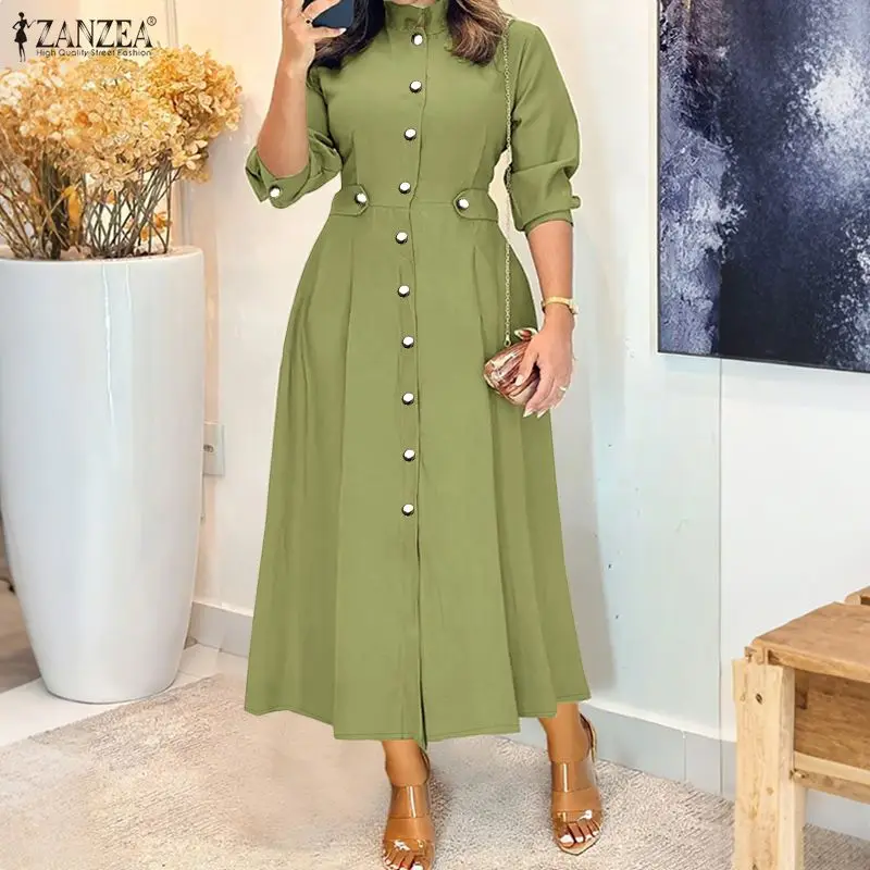 ZANZEA Plus Size Women's Midi Dresses Elegant Casual Mock Neck Long Sleeve Button Up A-Line Long Dress FW Woman Clothing 5XL