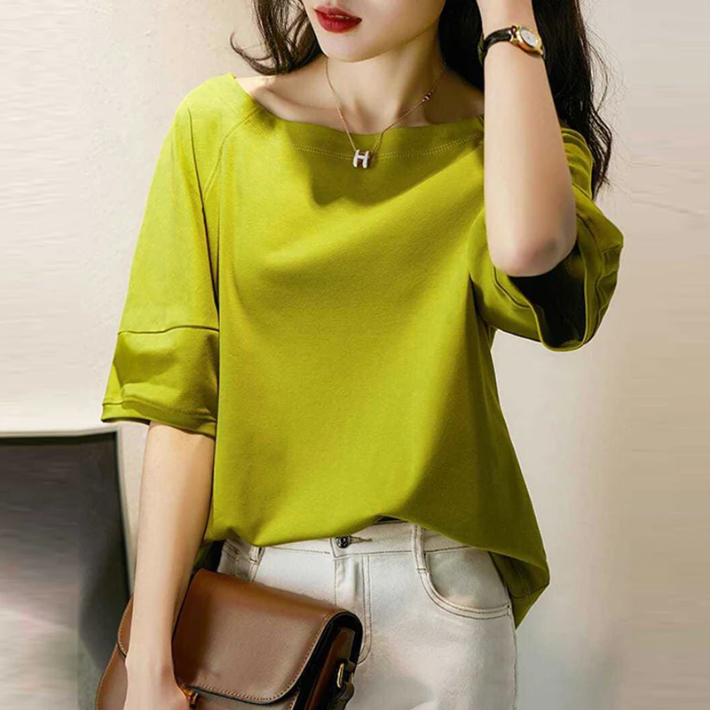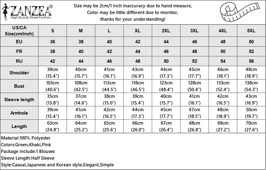 Material:100% Polyester Colors:Green,Khaki,Pink Package include:1 Blouses Cutting:Regular Stretch:Not Stretchable Collar:Boat neck Sleeve Style:Regular Sleeve Length:Half Sleeve Pattern:Solid Thickness:Standard Style:Casual,Japanese and Korean style,Elegant,Simple Season:Spring,Summer,Autumn Occasion:Daily,Simple,Casual Label: Yes Attention: 1. Due to different computers, there may be subtle color difference between the object and the image. Please don't shoot if you mind. Thank you. 2. There may be manual measurement error of 1-3cm. Please understand the inconvenience. 3. Please refer to the real object. The model pictures are for reference only. 4. Attention!!! Please check the size chart carefully before ordering." |