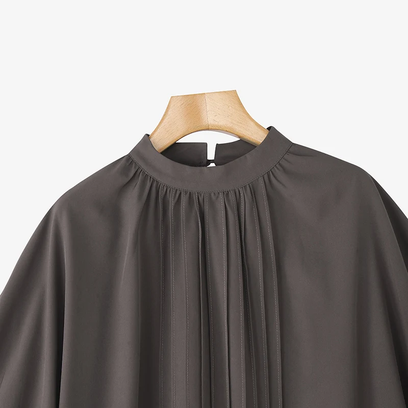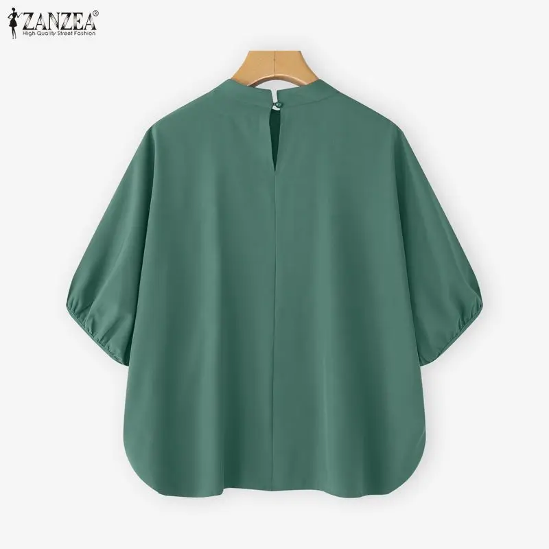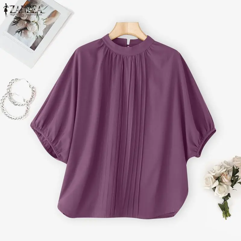 ZANZEA Women Pleated Elegant Blouse 2025 Fashion Tops Casual Half Puff Sleeve Loose Solid Shirts Stand Collar Office Lady Blusas